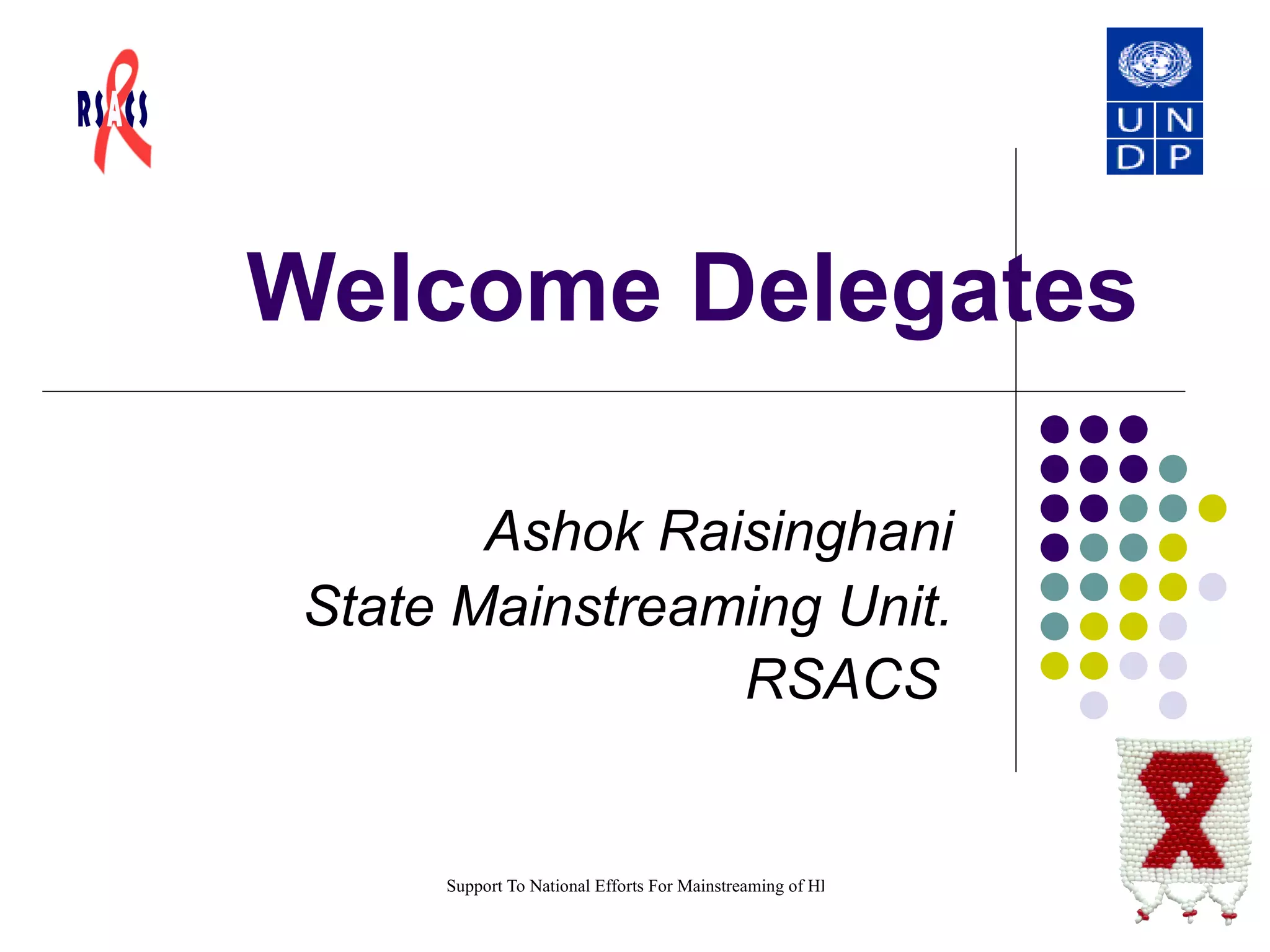 The document discusses mainstreaming HIV/AIDS interventions across various sectors in India. It notes that HIV/AIDS has spread widely in India, especially in rural areas, necessitating a multi-sectoral response. Mainstreaming involves addressing HIV/AIDS internally and externally across all sectors. Examples are given of mainstreaming HIV/AIDS awareness and services within government departments like rural development, tourism, panchayati raj, and urban development as well as private sectors. The roles and potential activities of these sectors for effective mainstreaming are outlined.