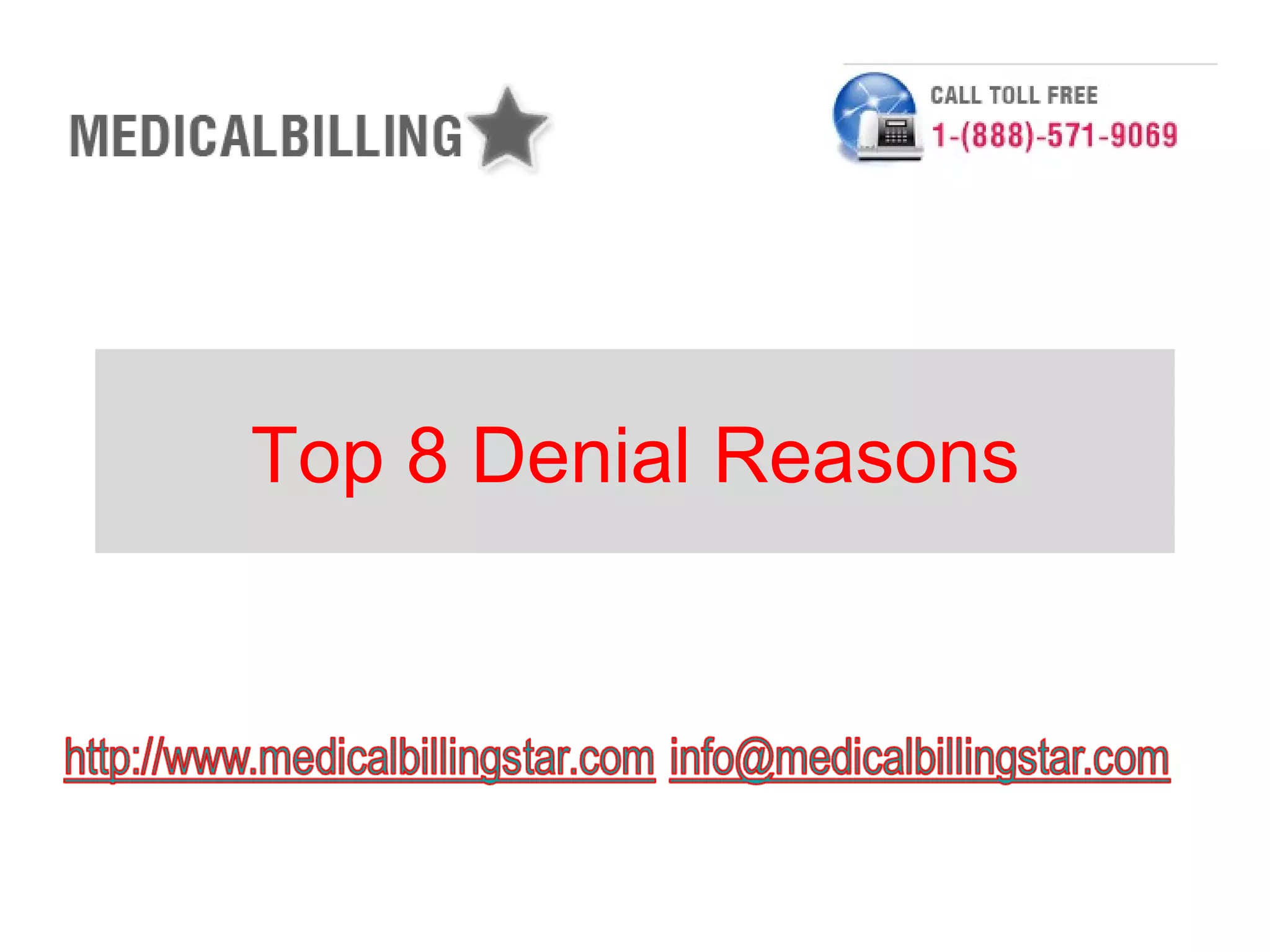 The document outlines the top eight reasons for claim denials in medical billing, including issues such as claims not on file, invalid codes, and lack of authorization. It details the actions taken by the billing office to address these issues and specifies the responsibilities of both patients and providers. Additionally, it provides statistical data on denial cases and amounts charged and received, emphasizing the importance of effective denial management in minimizing lost revenue.