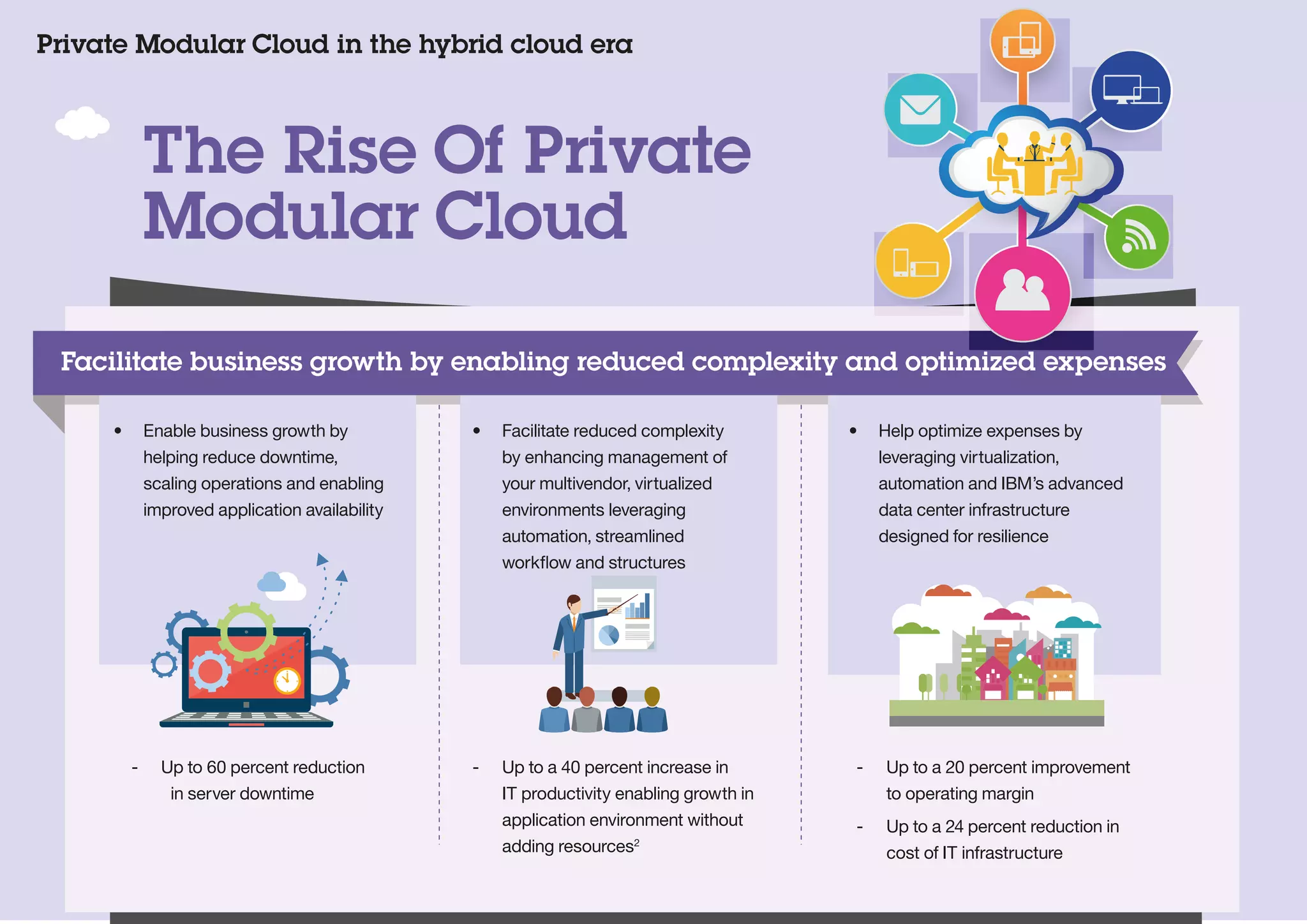 The document discusses the advantages of IBM's Private Modular Cloud in the hybrid cloud era, emphasizing reduced downtime, enhanced IT productivity, and optimized expenses. It highlights features such as automation, flexibility in scaling, and tailored solutions to meet specific business needs. Key benefits include faster deployment, improved operational margins, and the ability to leverage existing infrastructure efficiently.