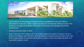 This document provides information about Indus University, the SAE Supra competition, and Team Vayuputras' formula-style racing car project. Indus University was established in 2006 and aims to bring social change through education. SAE Supra is a national competition that challenges students to design, build, and race a formula car. Team Vayuputras, consisting of 25 motorsports students from Indus University, is designing and fabricating an open-wheel racing car to compete in SAE Supra using cutting-edge simulation and fabrication techniques. They provide details on their goals, supporters, past achievements in competitions, and cost estimates for their current project.