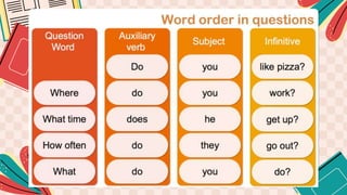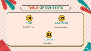 This document provides an overview of question types in the present simple tense for a first year class. It includes a table of contents with sections on starting, developing, and closing a role-play exercise. The development section explains there are four types of questions and includes a role-play between a journalist and artist to demonstrate questions.