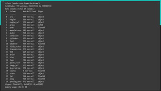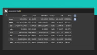 The document outlines a project focused on used car price analysis, emphasizing the importance of data collection, preprocessing, feature selection, model selection, evaluation, deployment, and maintenance. It highlights the distribution characteristics of various features such as year, kilometers driven, mileage, engine power, and price, noting the presence of outliers in certain cases. The analysis ultimately aims to enhance the accuracy of the predictive model used for assessing used car prices.