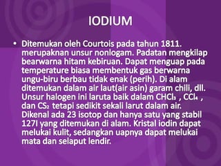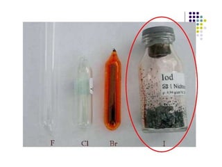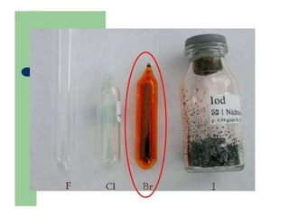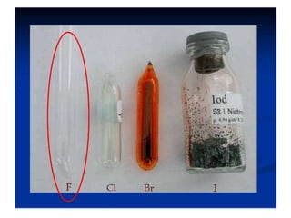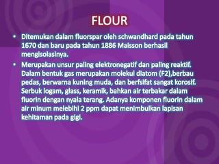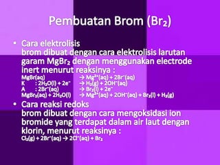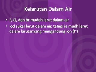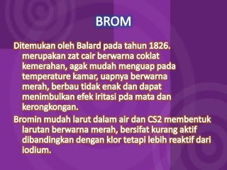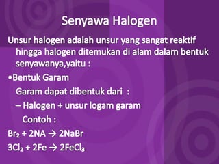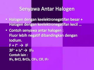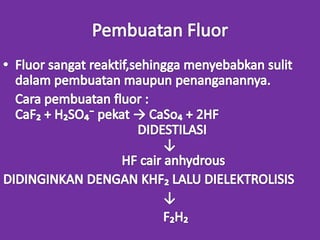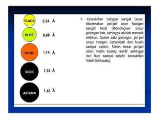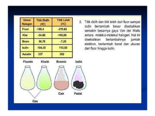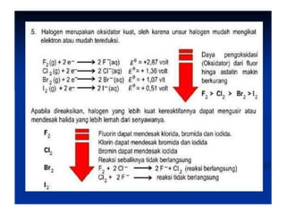 Dokumen ini membahas tentang halogen dan asam halida. Ia menyajikan tabel persentase disosiasi asam halida HF, HCl, HBr, dan HI. Kemudian menjelaskan oksidasi halogen, asam oksihalogen, dan nama umum mereka. Juga dibahas tentang pembuatan klor secara komersial dengan elektrolisis larutan natrium klorida dan pembuatan iodin di laboratorium melalui reaksi MnO2, Kl, dan H2SO4 yang mendidih.