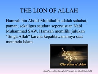 Hamzah bin Abdul Muthalib dikenal sebagai paman dan saudara sepersusuan Nabi Muhammad yang sangat setia membela agama Islam. Ia dijuluki "Singa Allah" karena keberanian dan pengorbanannya dalam perang Badar dan akhirnya gugur sebagai syahid di Perang Uhud melawan kaum musyrik Quraisy. Hamzah memiliki semangat perjuangan yang luar biasa untuk melindungi Islam bahkan rela mengorbankan nyawanya.