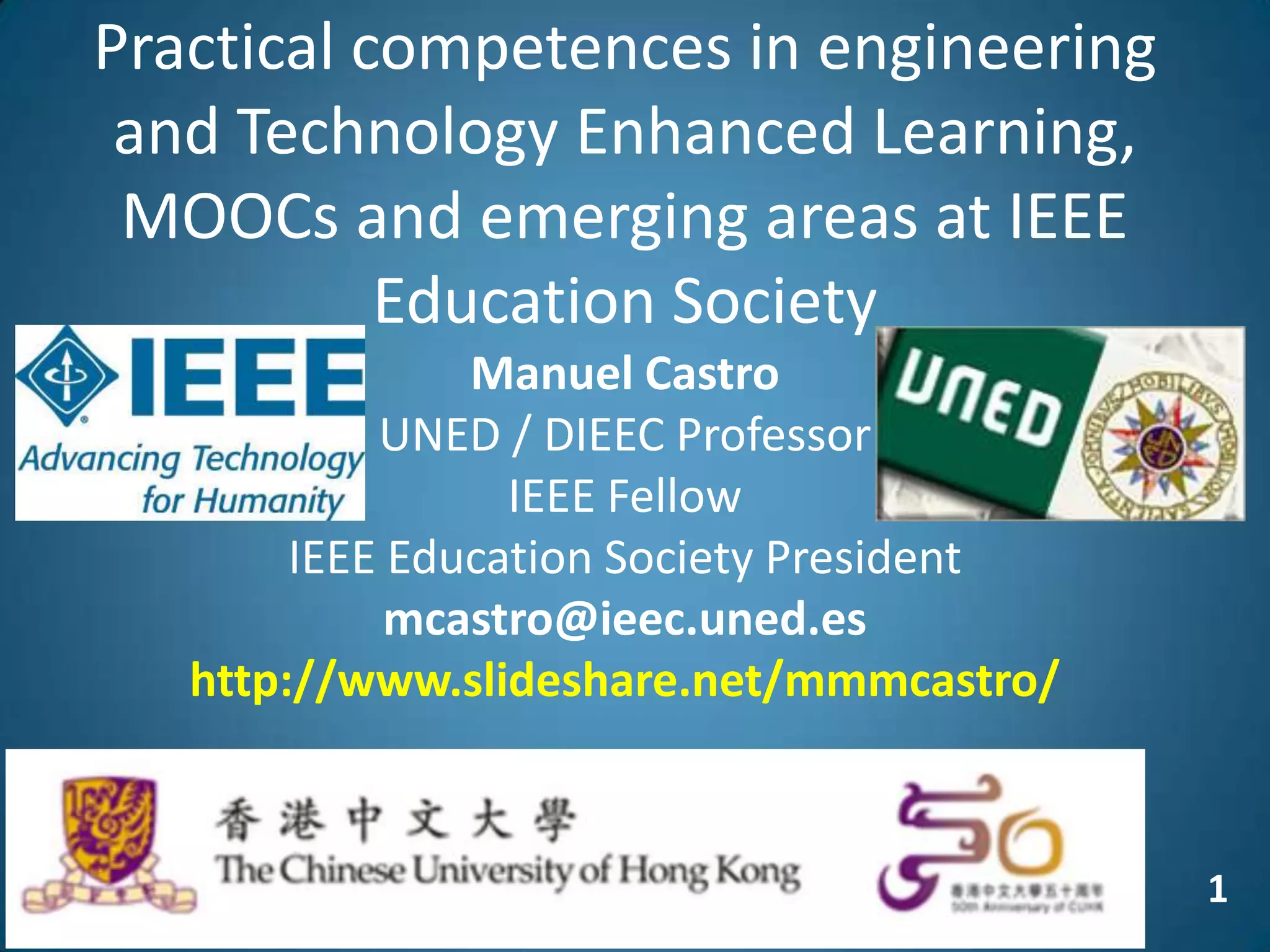 The document discusses the evolution of engineering education through advancements in technology, including practical competencies, MOOCs, and online labs. It emphasizes the importance of open education resources, shared architectures, and e-learning standards to enhance learning experiences and accessibility. Furthermore, it addresses the challenges and future potential of integrating innovative technologies, such as IoT and cloud computing, into educational frameworks.