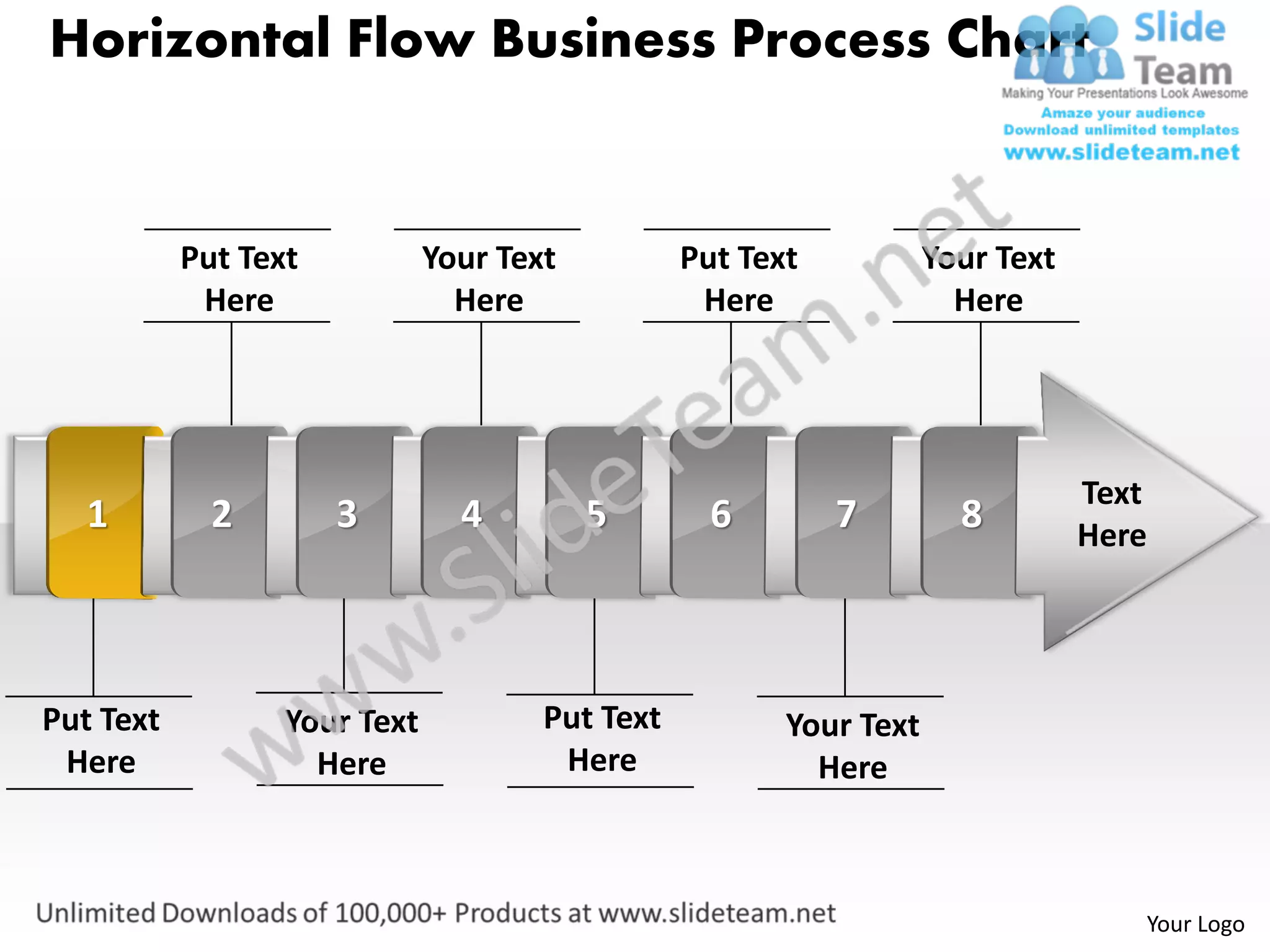 The document is a template for a horizontal flow business process chart. It contains placeholder text and areas for custom text and logos. The template includes multiple sections that can be edited by ungrouping objects, changing colors using the format shape menu or theme colors, and dragging arrows to connect sections.