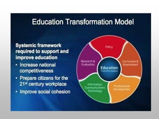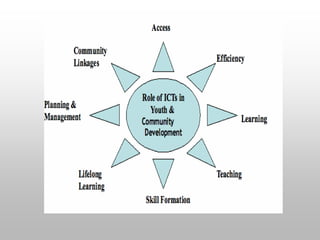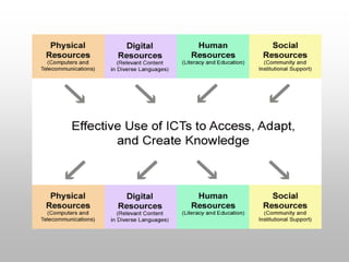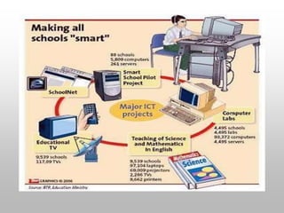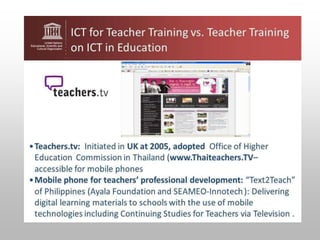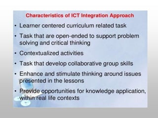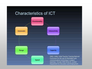 This document discusses information and communication technology (ICT) in education. It defines ICT as the use of hardware and software to manage information efficiently. Research shows that ICT can improve student learning and teaching methods by positively impacting student achievement in subjects like math, science, and social studies. ICT in education means teaching and learning through technologies like computers, the internet, and multimedia tools. UNESCO promotes the effective use of ICT to improve access, equity, quality, and inclusion in education worldwide.