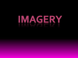 The document discusses different types of imagery used in poetry. It defines imagery as the use of vivid description that creates mental pictures or images in the reader's mind by appealing to their senses. There are five main types of imagery - visual, auditory, kinesthetic, olfactory, and gustatory - corresponding to the five senses of sight, hearing, touch, smell, and taste. Good poets use imagery to present their subject matter in a way that engages the reader's senses and imagination.