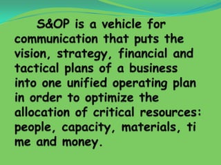 Sales and operations planning (S&OP) is a process that achieves alignment between various functions of an organization including sales, production, inventory and finance. It develops a coordinated operating plan that balances supply and demand at a volume level in support of customer demand and business strategy. The S&OP process results in monthly planning activities based on an annual operations plan and provides benefits such as enhanced teamwork, better decision making and financial planning, and increased accountability.