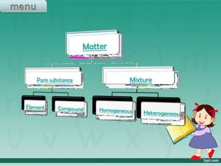 This document defines elements, compounds, and mixtures. It provides examples of common elements like hydrogen, oxygen, and carbon. Elements are made of atoms and cannot be broken down further. Compounds are formed when elements chemically combine in molecules. Compounds have different properties than their constituent elements. Mixtures contain elements or compounds mixed together but not chemically combined. Mixtures can be either homogeneous, with a uniform composition, or heterogeneous, containing distinct substances or phases.
