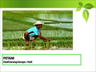 Dokumen ini menjelaskan dua jenis pekerjaan, yaitu yang menghasilkan barang dan yang menghasilkan jasa. Contoh pekerjaan yang menghasilkan barang termasuk perajin keramik, perajin kayu, dan penjahit. Pekerjaan yang menghasilkan jasa tidak dijelaskan lebih lanjut dalam dokumen ini.