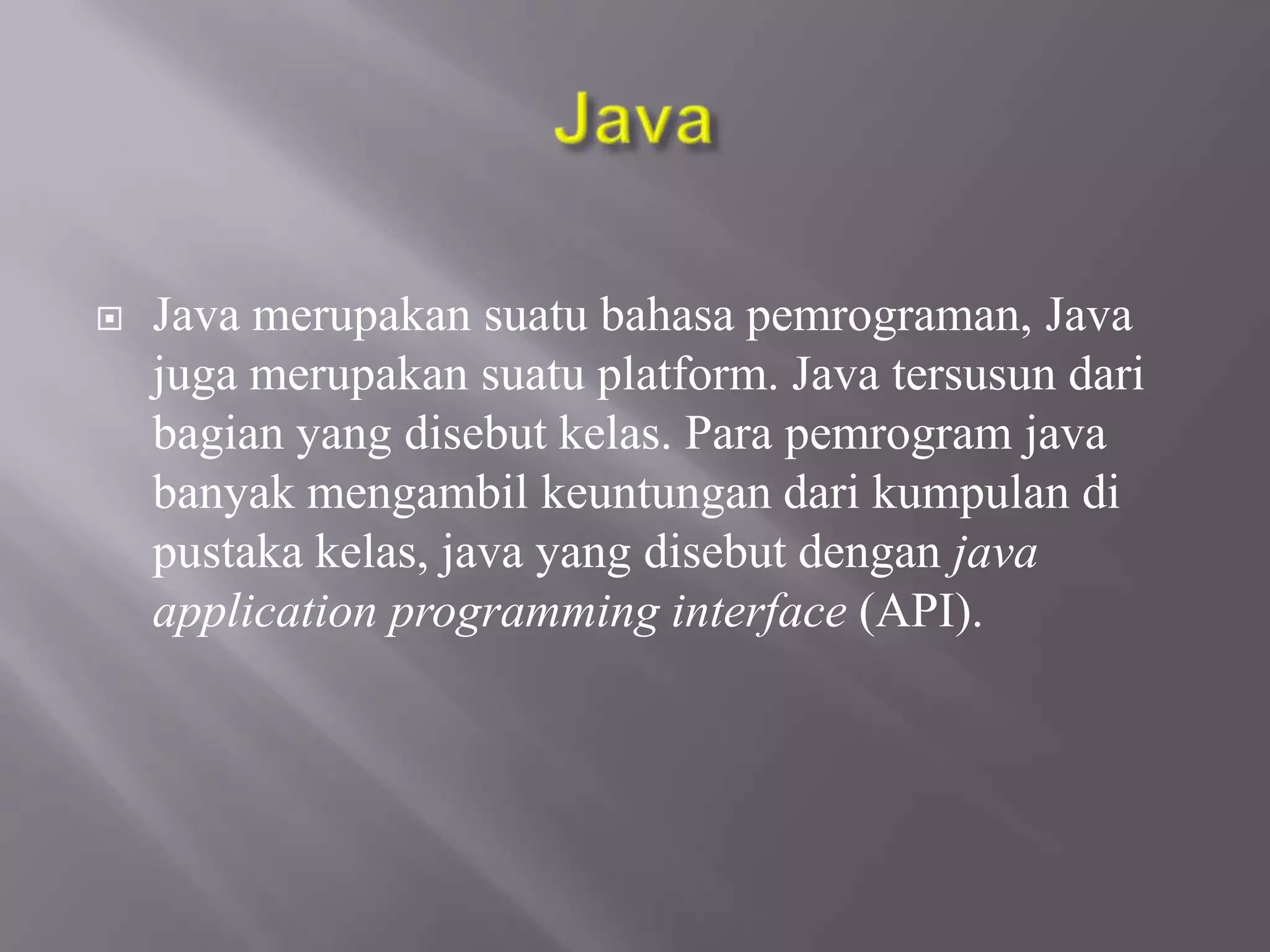 Java adalah bahasa pemrograman dan platform yang terdiri dari bagian-bagian seperti kelas dan API. Terdapat beberapa versi Java, di antaranya J2SE untuk aplikasi desktop, J2EE untuk aplikasi enterprise, dan J2ME untuk perangkat dengan sumber daya terbatas. Meskipun Java dikenal karena sifat multiplatform dan keamanan, ia juga memiliki kelemahan dalam penggunaan memori dan kecepatan dibandingkan dengan bahasa lain seperti C++.