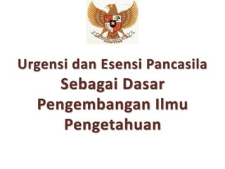 Dokumen tersebut membahas tentang ilmu pengetahuan dan pentingnya menjadikan Pancasila sebagai dasar pengembangannya. Ilmu pengetahuan adalah pengetahuan yang bersifat ilmiah dengan memiliki objek, metode, sistematis, rasional, dan dapat diverifikasi. Pancasila perlu menjadi dasar pengembangan ilmu pengetahuan dalam tiga aspek: ontologis sebagai aktivitas masyarakat Indonesia, epistemologis sebagai metode berpikir