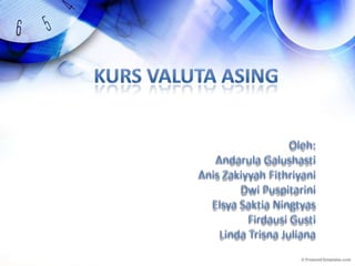 Dokumen tersebut membahas tentang pengertian kurs dan valuta asing, faktor yang mempengaruhinya, sistem nilai tukar valuta asing, dan contoh perhitungan nilai tukar.
