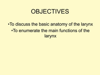 The document provides information on the anatomy and physiology of the larynx. It discusses the larynx's location in the neck, its composition of cartilages, muscles, and ligaments. The key functions of the larynx are identified as protection of the respiratory tract, respiration, phonation (voice production), fixation of the chest, and closure of the glottis. Diagrams are included showing the anterior and posterior views of the larynx cavities and structures.