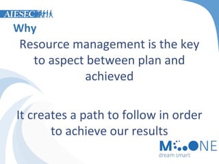 Resource management is key to achieving planned results by creating a path to follow. Proper human resource (HR) management and capacity planning are essential, including recruiting strategically and preventing HR crises. Capacity should be planned for each local committee's goals, structures, and HR. The vice president of talent management (VPTM) profile focuses on ensuring quality of experience for members through learning and development strategy, talent management, and synergy between local and central teams.