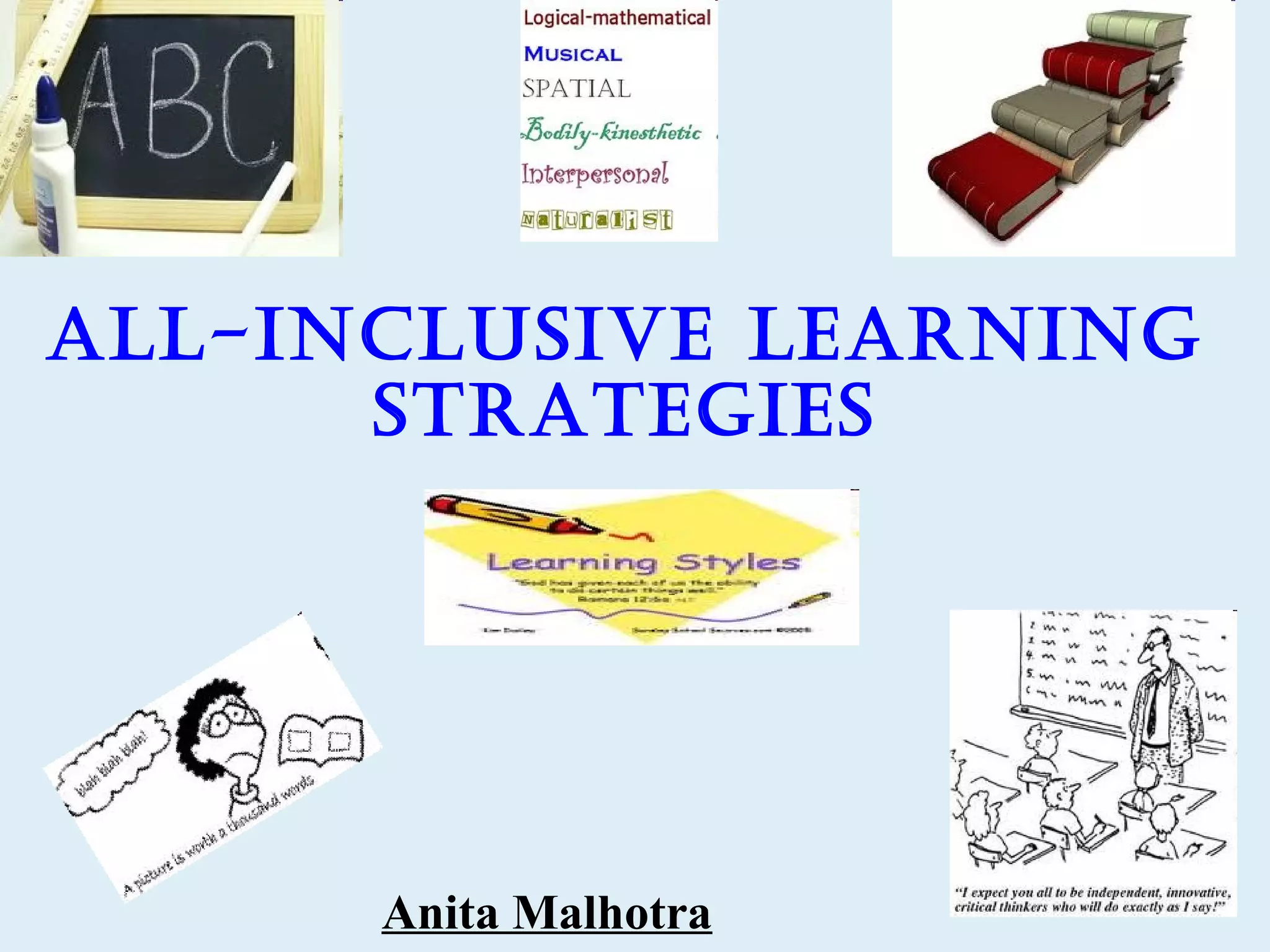 This document discusses strategies for all-inclusive learning. It begins by asking teachers to reflect on students who struggled in school. It then discusses challenges in motivating these at-risk students and implementing new instructional approaches. The rest of the document provides strategies for teachers, including understanding different learning styles, providing feedback, balancing challenges, and establishing a sense of belonging in the classroom. The overall message is that using diverse, supportive teaching strategies can help engage even the most difficult students.
