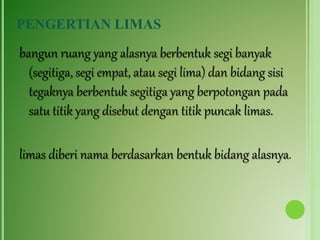 Dokumen tersebut membahas tentang pengertian dan unsur-unsur limas, termasuk sisi, rusuk, titik sudut, bidang diagonal, jaring-jaring, luas permukaan dan volume limas. Contoh soal juga diberikan untuk mendemonstrasikan perhitungan luas permukaan dan volume limas.