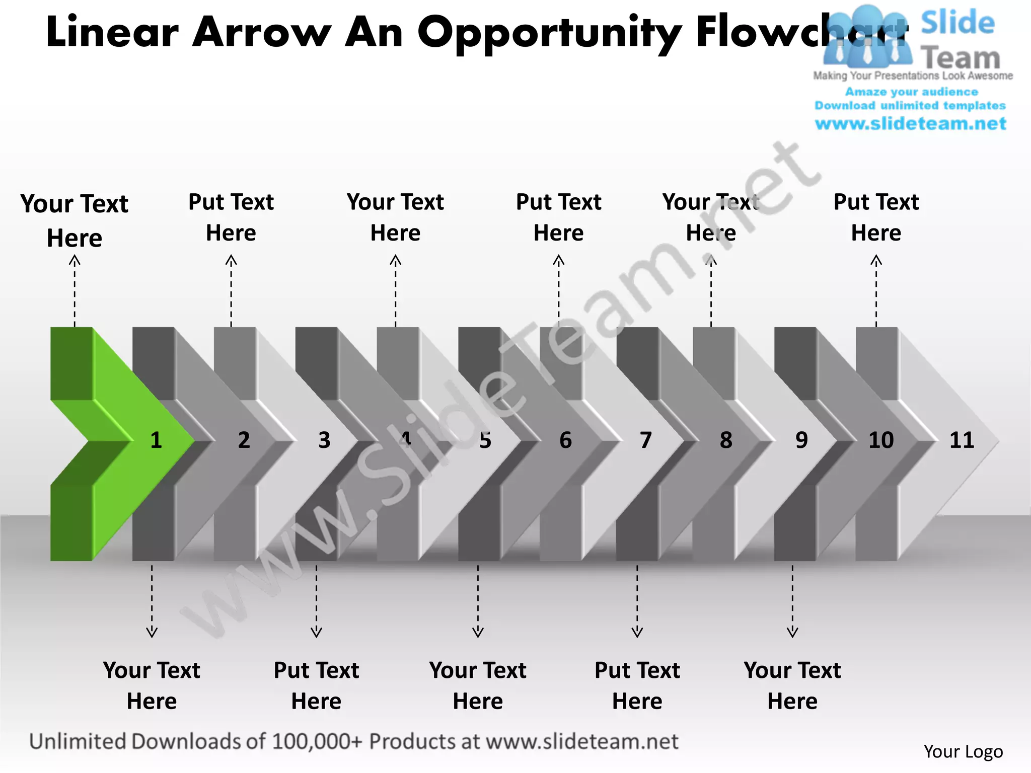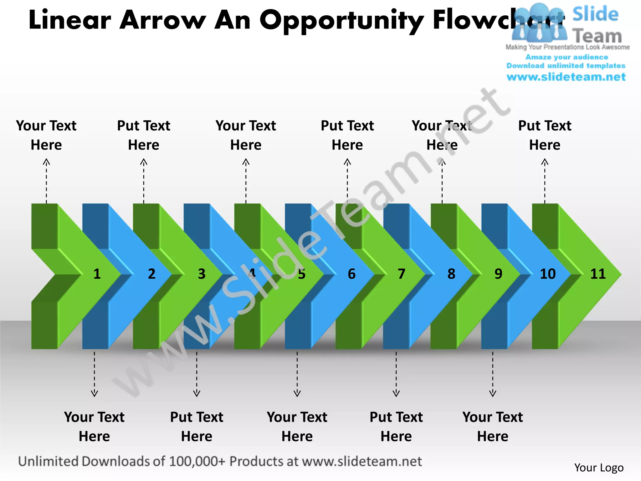 The document is a template for a linear arrow opportunity flowchart. It contains instructions for customizing the template by editing text boxes, changing colors, ungrouping objects, and using theme colors. The template includes multiple pages and allows full customization of icons, text, sizes, orientations and colors.