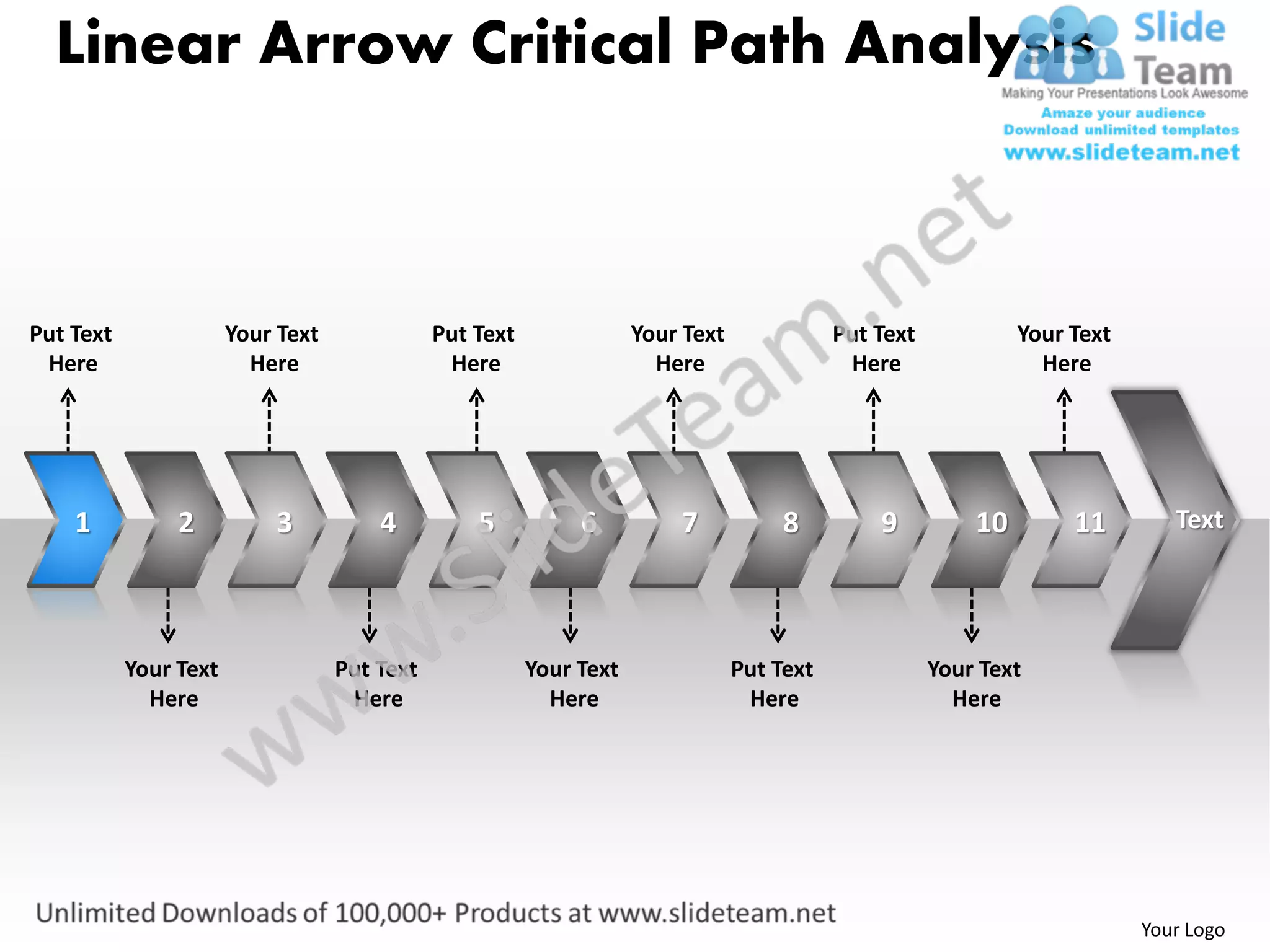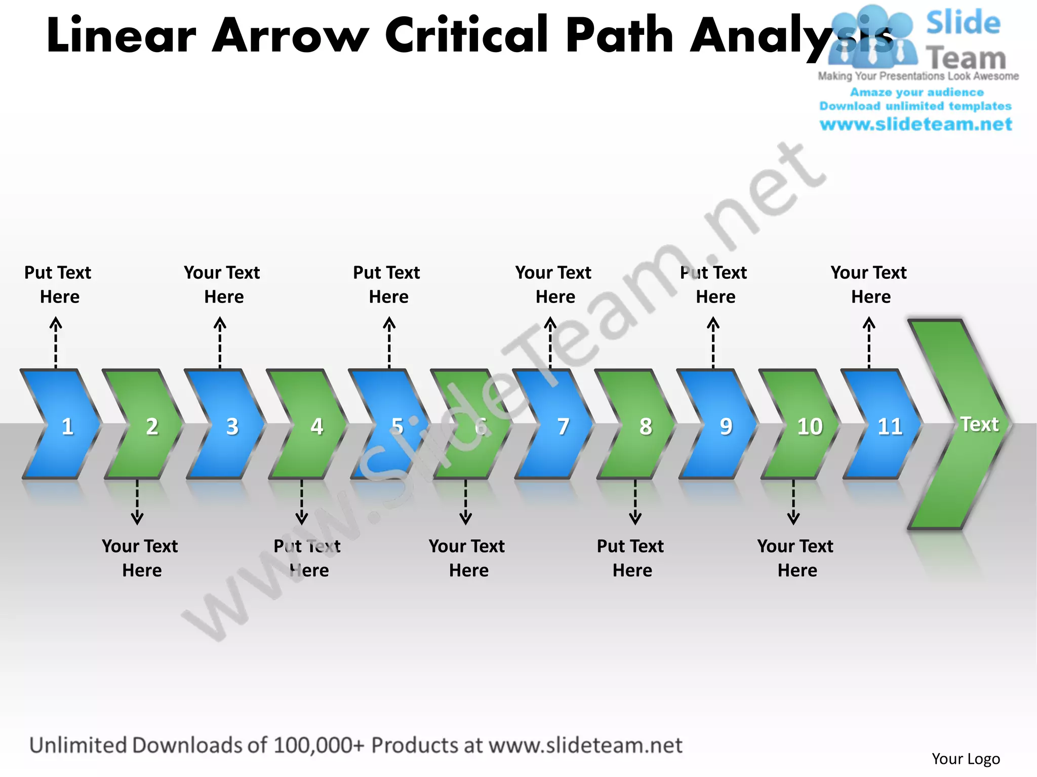 The document describes a linear arrow critical path analysis. It uses arrows to represent the sequence and dependencies of tasks in a project. The analysis likely involves identifying the longest continuous chain of dependent tasks in a project as the critical path, which must be completed on time or the whole project will be delayed.