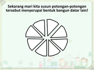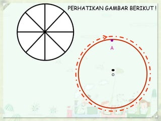 Dokumen tersebut memberikan penjelasan mengenai unsur-unsur lingkaran seperti pusat, jari-jari, diameter, busur, tali busur, juring, dan tembereng. Kemudian dijelaskan rumus untuk menghitung keliling dan luas lingkaran berdasarkan unsur-unsur tersebut. Diakhiri dengan contoh soal penerapan rumus keliling dan luas lingkaran.