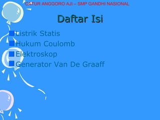 Dokumen ini membahas konsep dasar listrik statis, termasuk hukum Coulomb, sifat muatan listrik, serta cara menginduksi dan mengukur muatan listrik. Dikenalkan juga alat seperti elektroskop dan generator Van de Graaff, serta aplikasi praktis listrik statis dalam berbagai bidang. Akhirnya, dijelaskan tentang bahaya dan penggunaan listrik statis dalam kehidupan sehari-hari.