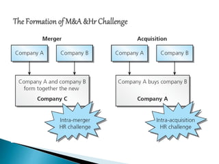 The document discusses several key factors for successful mergers and acquisitions including managing cultural differences between companies, retaining key employees, ensuring compliance with laws, aligning compensation plans, assessing cultural fit, and clear communication. It provides details on GE Capital's acquisition strategy which includes appointing integration managers, forming executive teams from both companies, developing a 100 day communication strategy, assessing workflows during integration, and providing long-term adjustment and discussions. The strategy focuses on open communication, job security, and orientation training for acquired employees.