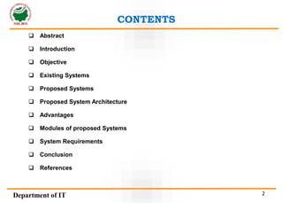 The document summarizes an online crime management system project. The proposed system aims to automate crime records management to overcome limitations of manual systems like lack of security, time consumption, and large paperwork. It has modules for inspector login, crime reports, FIR registration, case records, criminal records search, and officer transfers. The system uses a Java-based architecture with a MySQL database for storage. It is intended to provide efficient, secure and easy access to crime information for police stations across the country.