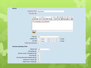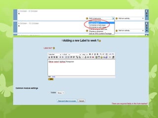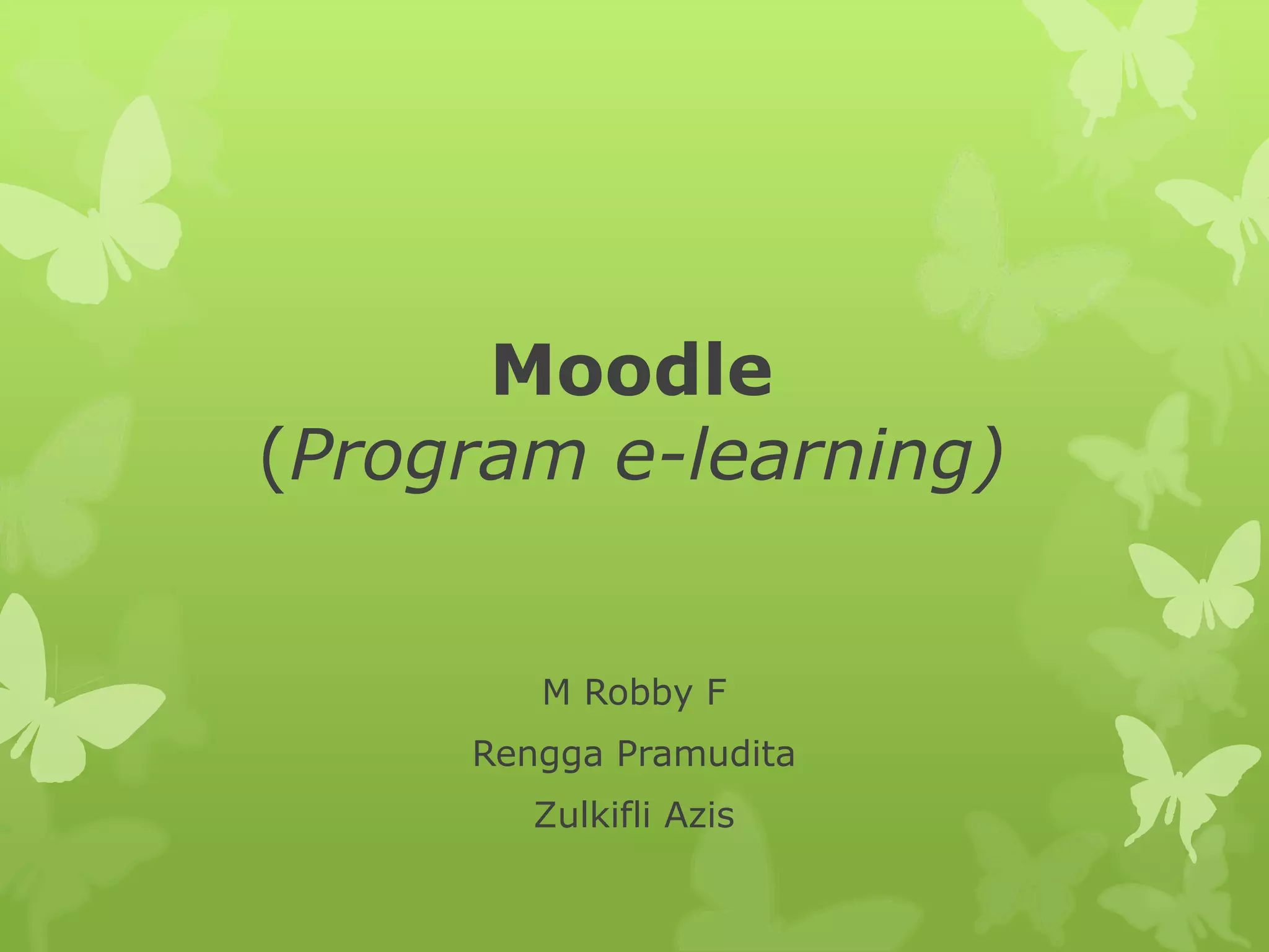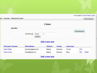 Dokumen ini menjelaskan fitur-fitur Moodle, termasuk cara menginstal dan mengonfigurasi platform e-learning tersebut. Pengguna dapat membuat pengguna, kategori, subkategori, kursus, dan menambahkan bahan ajar serta tugas. Selain itu, dokumentasi juga mencakup pembuatan ujian online dan manajemen soal dengan format Aiken.