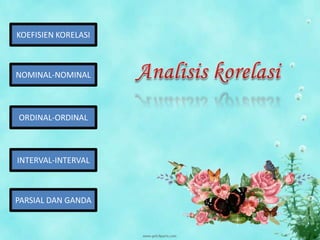 Dokumen ini membahas analisis korelasi, yang menunjukkan hubungan antara dua atau lebih variabel, termasuk jenis-jenis korelasi berdasarkan skala pengukuran. Terdapat beberapa formula untuk menguji hubungan variabel, seperti phi coefficient untuk nominal dan koefisien Spearman untuk ordinal. Korelasi parsial dan ganda juga dijelaskan sebagai cara untuk mengukur kekuatan hubungan variabel dengan satu variabel konstan.