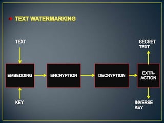 This document compares watermarking and cryptography. It discusses that watermarking involves hiding secret information in digital images while cryptography transforms information into an unreadable format. Watermarking provides security and an extra layer of authentication while cryptography focuses on protecting the meaning of documents. The document also outlines some advantages and disadvantages of each technique such as watermarking being more resistant to attacks but cryptography providing better security through encryption.
