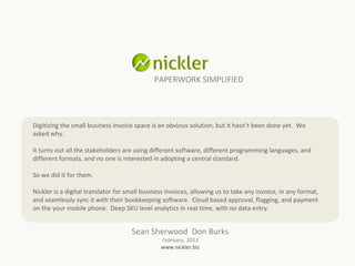 Nickler is a digital invoice platform that allows small businesses to sync invoices from any format or software to their bookkeeping software. It provides cloud-based invoice approval, payments, and deep SKU-level analytics in real time without data entry. The founders saw an opportunity to digitize and standardize the fragmented invoice process for small businesses by creating a platform that different stakeholders can all use.