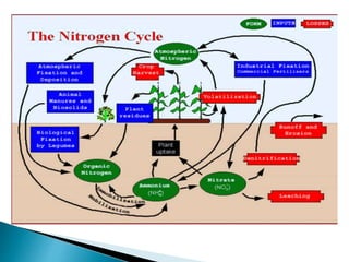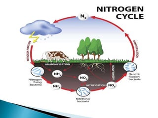 The document discusses the nitrogen cycle, which is the biogeochemical cycle by which nitrogen is converted between its various chemical forms. It involves the conversion of atmospheric nitrogen into organic nitrogen by biological nitrogen fixation, which is carried out by bacteria and cyanobacteria. This fixed nitrogen is then assimilated by plants and converted to protein and nucleic acids. The nitrogen in organic matter is then converted back to inorganic forms through ammonification, nitrification, and denitrification, completing the cycle. The nitrogen cycle is essential for life on Earth as it regulates the nitrogen necessary for all organisms.