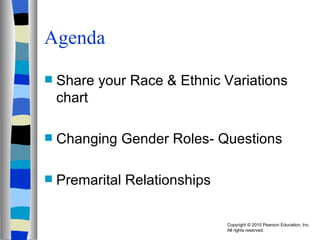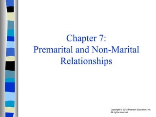 The document discusses premarital and non-marital relationships. It covers topics like the changing nature of love and partner selection, which now emphasizes individual needs over institutional norms. Types of early relationships like dating, hooking up, and cohabitation are examined in the context of the transition to marriage. The roles of sexuality, sexual orientation, and factors influencing sexual behavior are also summarized.