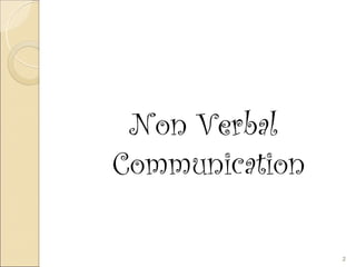 This document discusses nonverbal communication. It states that nonverbal communication accounts for 93% of the message received by listeners. Over 65% of social meaning is communicated nonverbally. Nonverbal communication can be intentional or unintentional, ambiguous, primary, continuous, and multichanneled. It functions to provide information, regulate interaction, express emotion, present an image, and express power/control. The main types discussed are kinesics, paralanguage, vocal interference, spatial usage, and self-presentation cues. Culture and gender can influence nonverbal signals. Improving nonverbal skills involves being conscious of and matching one's verbal and nonverbal communication.