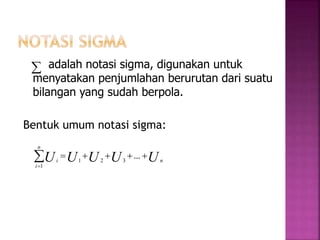 Teks tersebut membahas tentang notasi matematika sigma, bentuk umum deret aritmatika dan geometri, serta rumus untuk menghitung jumlah deret dan nilai suku tertentu.
