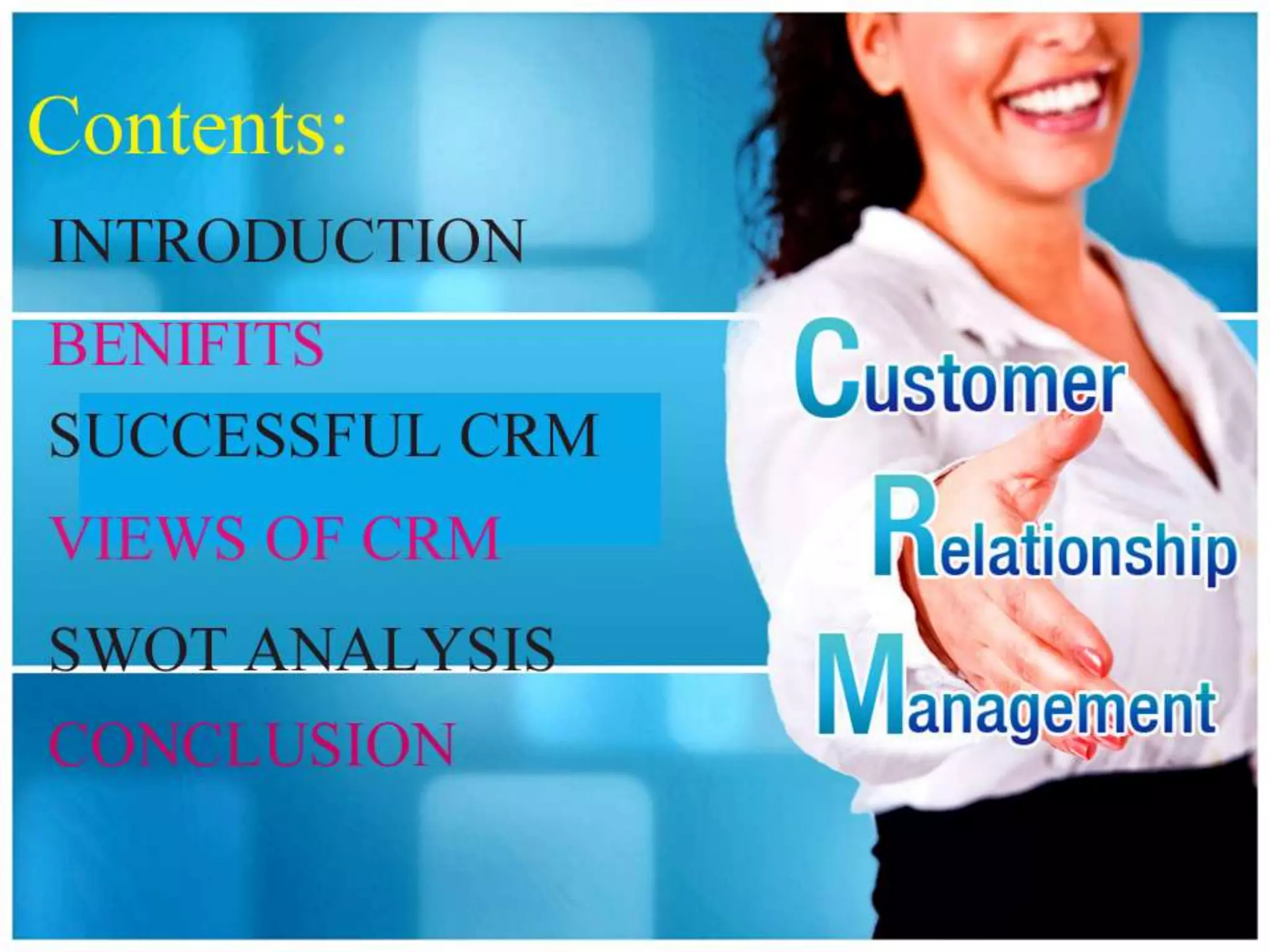 CRM involves developing long-term relationships with valuable customers through personalized attention. It maximizes customer lifetime value. A successful CRM implementation requires trained staff, good data use, integration of front and back office systems, and management support. CRM provides benefits like increased sales and profits but also risks like too much information or poor integration.