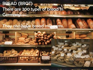 The document highlights various cultural and historical aspects of Germany, including its love for bread and beer, unique inventions, and transportation systems like the Wuppertal hanging railway. It also discusses traditional customs such as the German Christmas pickle and wedding practices, as well as the history of Indo-German relations and German environmental initiatives. Key innovations attributed to Germans include insulin, the light bulb, and the motorcycle, alongside famous brands like Audi and Mercedes.