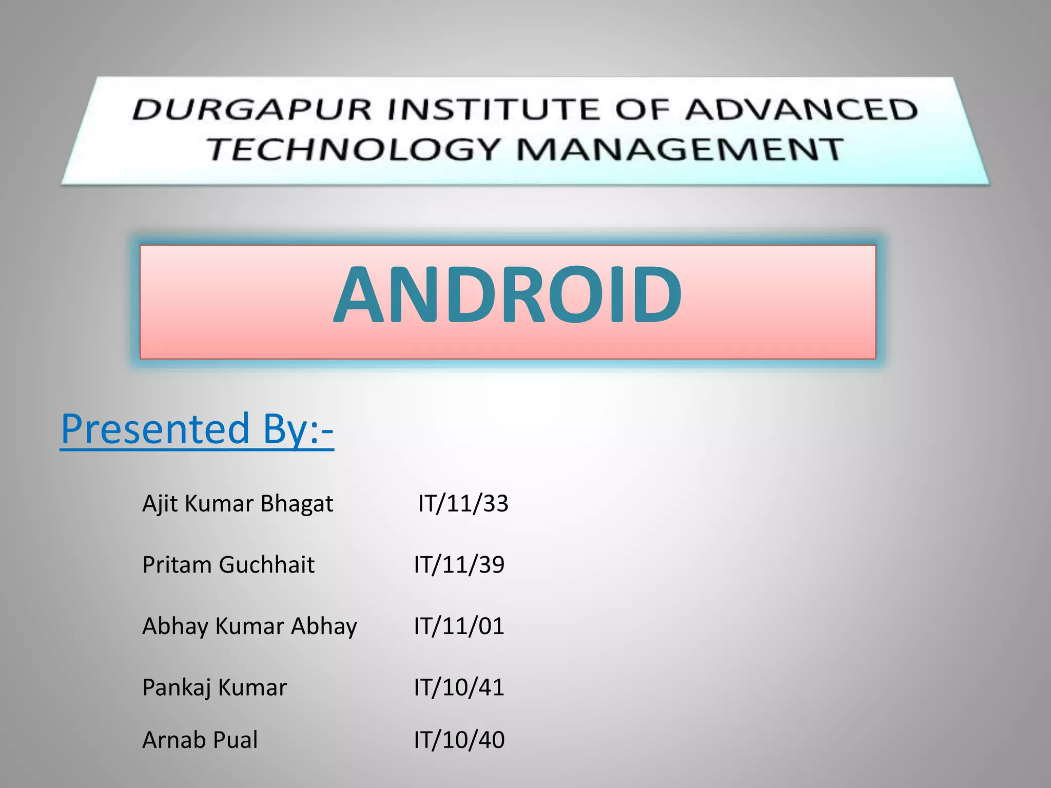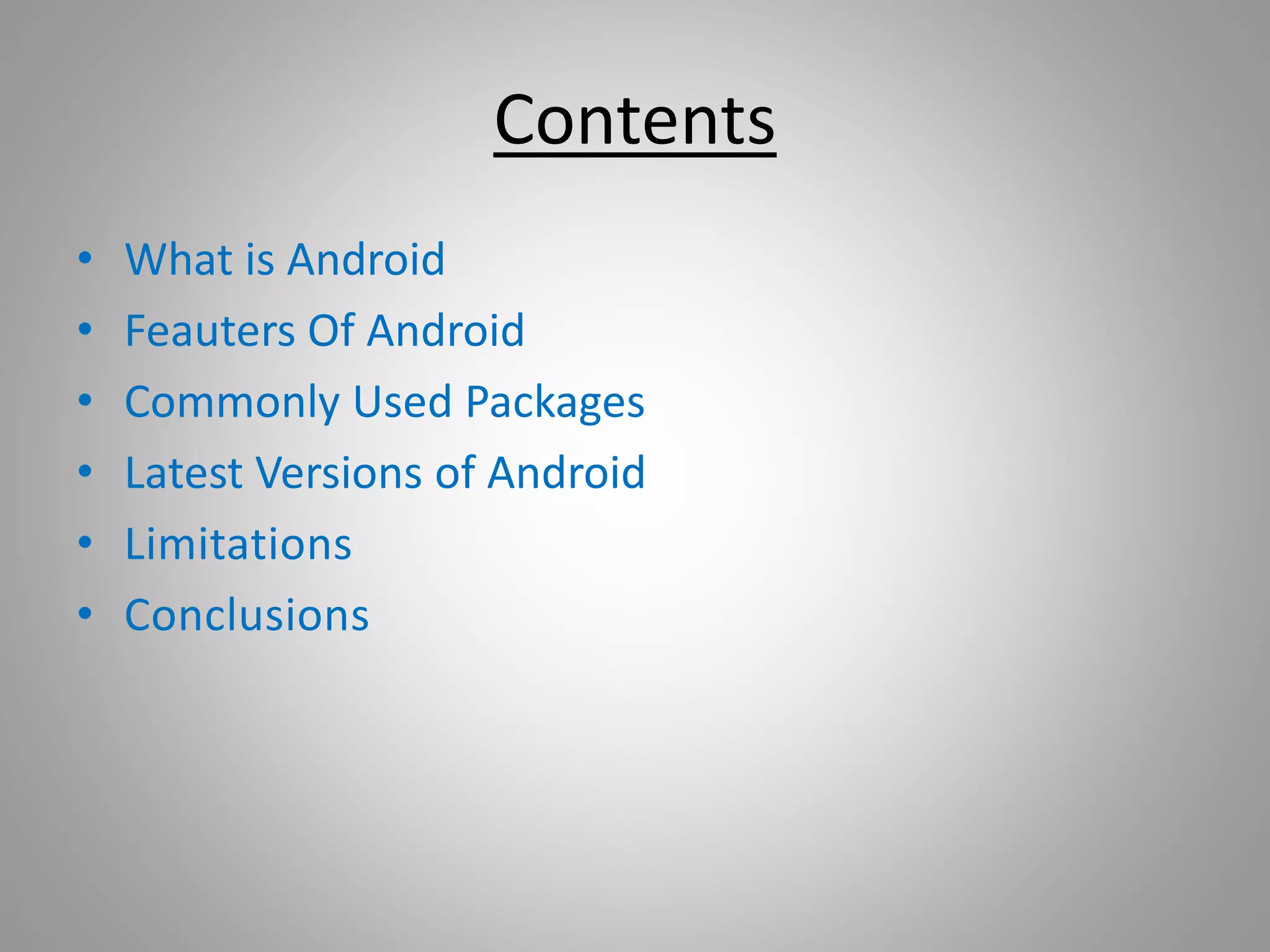 Android is an open source operating system created by Google for use on mobile devices. It is based on the Linux kernel and allows for programming in Java and C/C++. Android supports wireless communication technologies like 3G, 4G, WiFi and Bluetooth. It uses a multi-process architecture with each app running in its own process. Common Android packages provide user interface layout, secure networking, media support and optional hardware access like GPS. Recent Android versions include Honeycomb, Ice Cream Sandwich and Jelly Bean, with enhancements like tablet support, encryption, virtual buttons and a smoother interface. While popular, Android faces limitations such as attracting hackers due to open source code and higher battery usage than standard phones.