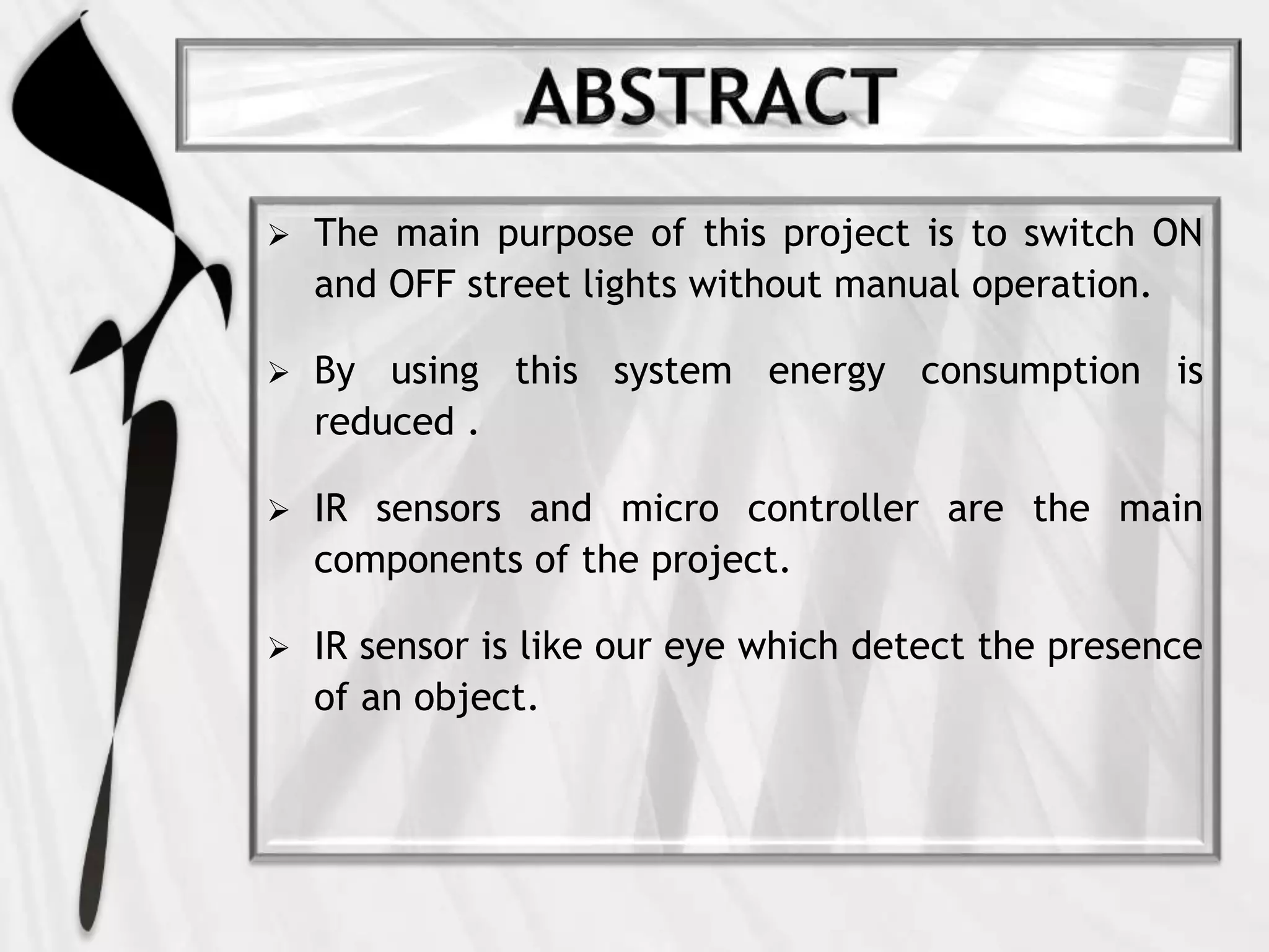 This document describes a project to automatically control street lights using infrared sensors and a microcontroller. The system is intended to reduce energy consumption by turning lights on only when vehicles are detected. Infrared sensors detect passing vehicles and signal the microcontroller, which then turns on the appropriate street lights. When the vehicle passes, the lights will turn off again after a set time. The goal is to reduce wasted electricity while providing lighting as needed.