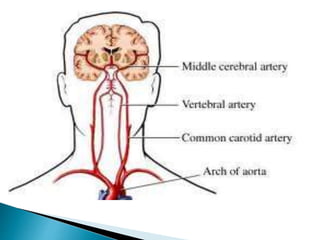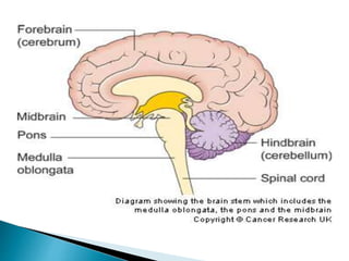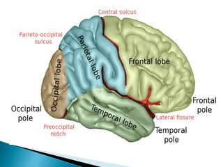The brain is the largest mass of nervous tissue in the body and lies within the cranial cavity. It receives around 15% of cardiac output and weighs approximately 1380g in males and 1250g in females. The brain is made up of the cerebrum, brain stem, and cerebellum. The cerebrum is the largest part and is divided into four lobes - frontal, parietal, occipital, and temporal - each serving different functions like reasoning, sensory processing, vision, and hearing/memory respectively. The brain stem connects the brain and spinal cord and contains the midbrain, pons, and medulla oblongata which are responsible for sensory/motor functions and vital activities like breathing and