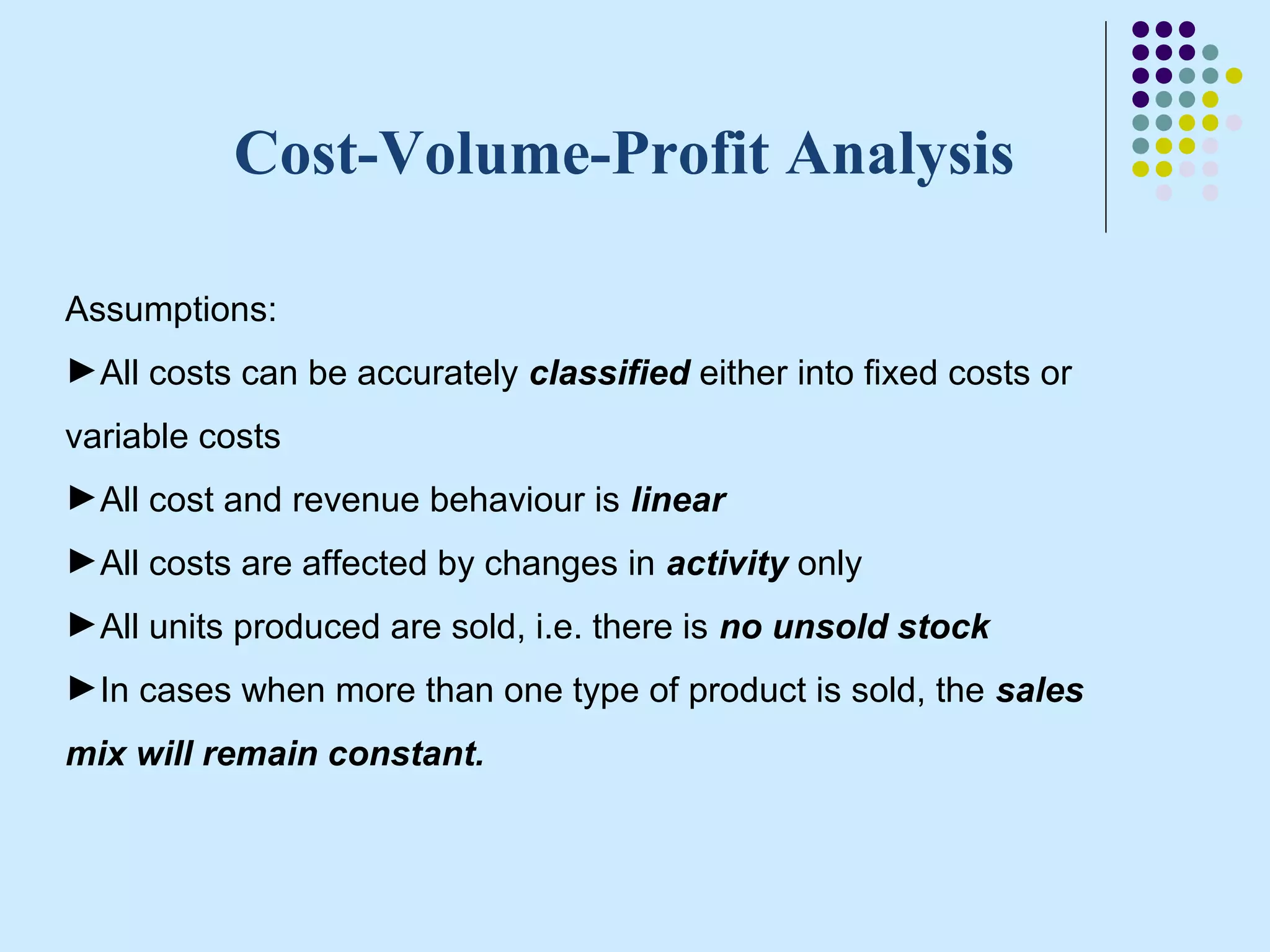 Cost-volume-profit analysis examines how changes in costs and sales volume affect a company's profit. It helps management make decisions about pricing, production levels, and facility choice. It shows how volume impacts total costs and profits. Key assumptions are accurate classification of fixed and variable costs and linear relationships. The breakeven point is where sales revenue equals total costs, with no profit or loss. Margin of safety is the difference between actual and breakeven sales levels, indicating a business's soundness.