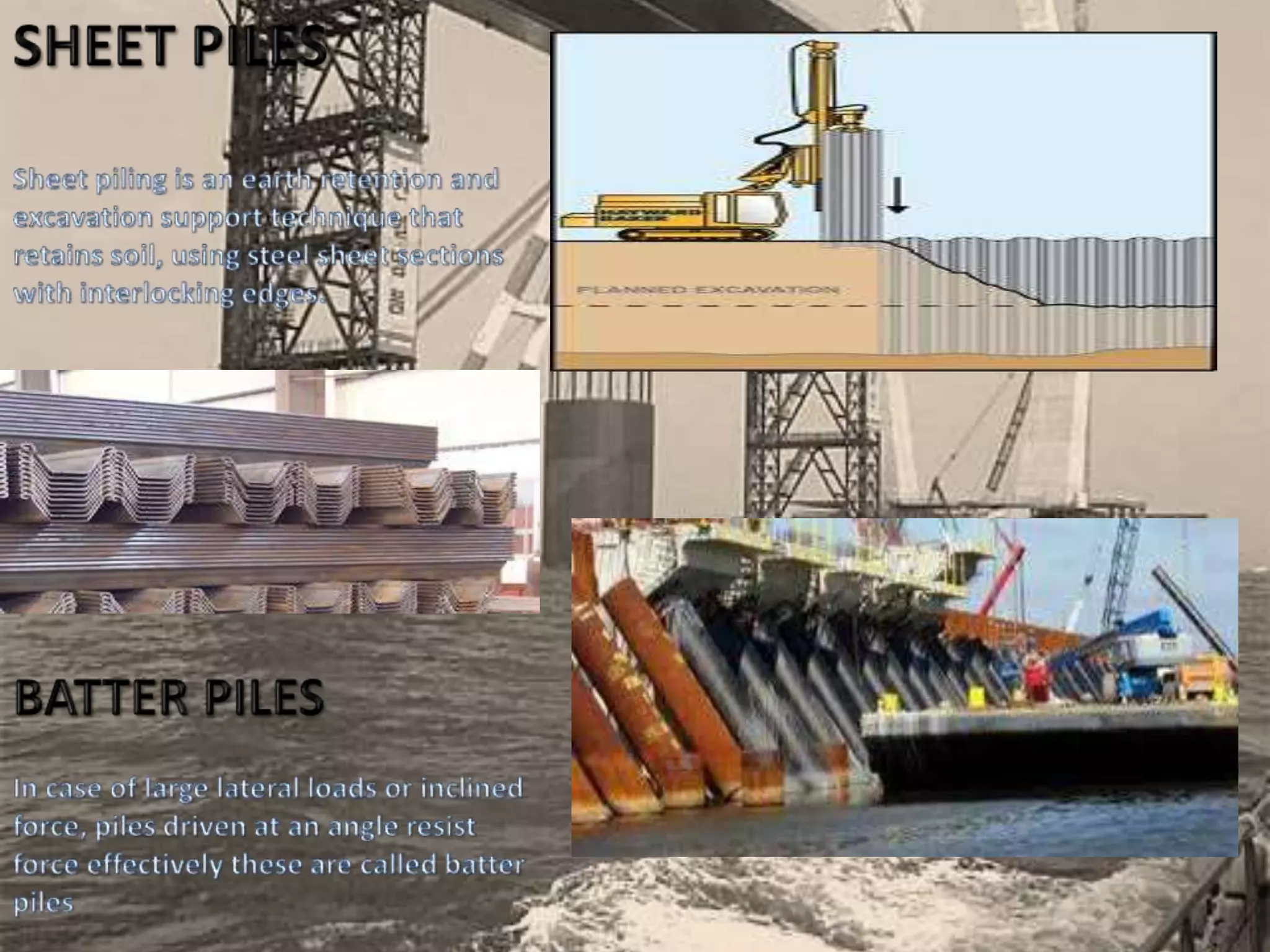 Different methods for pile driving including diesel hammer and vibratory methods.