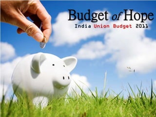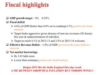 The budget document provides details on key fiscal targets and highlights from the Indian budget. The fiscal deficit target for the current year is 4.6% of GDP, which is better than the previous target but may be aggressive given other factors. Revenue deficit is a continuing concern. Some key points include reduced corporate tax surcharges, increased exemption limits for individual taxpayers, and changes to indirect taxes that will make some consumer goods cheaper and some services more expensive. Infrastructure spending saw a large increase but financing remains a challenge. Allocations to social sectors also increased substantially.