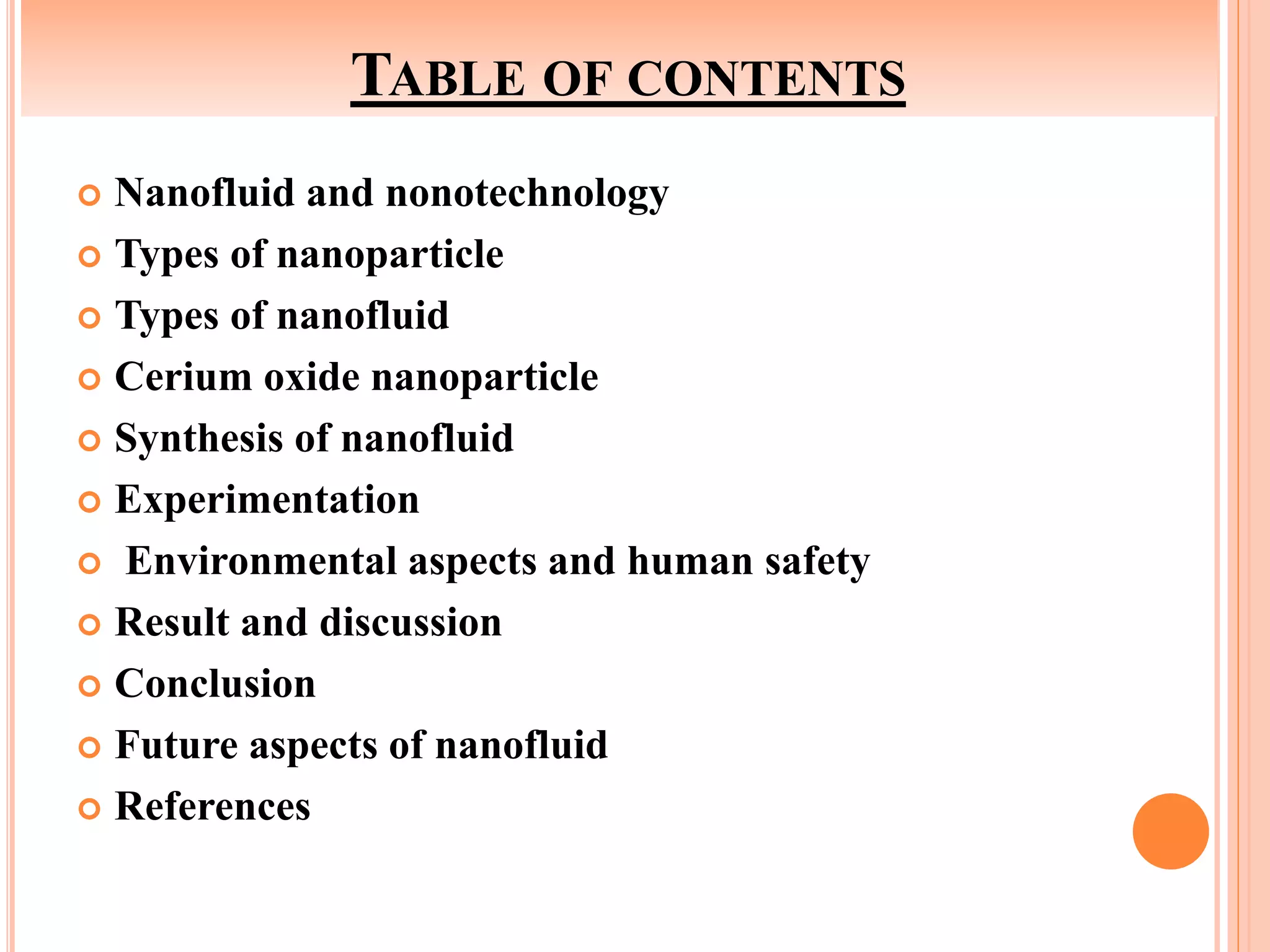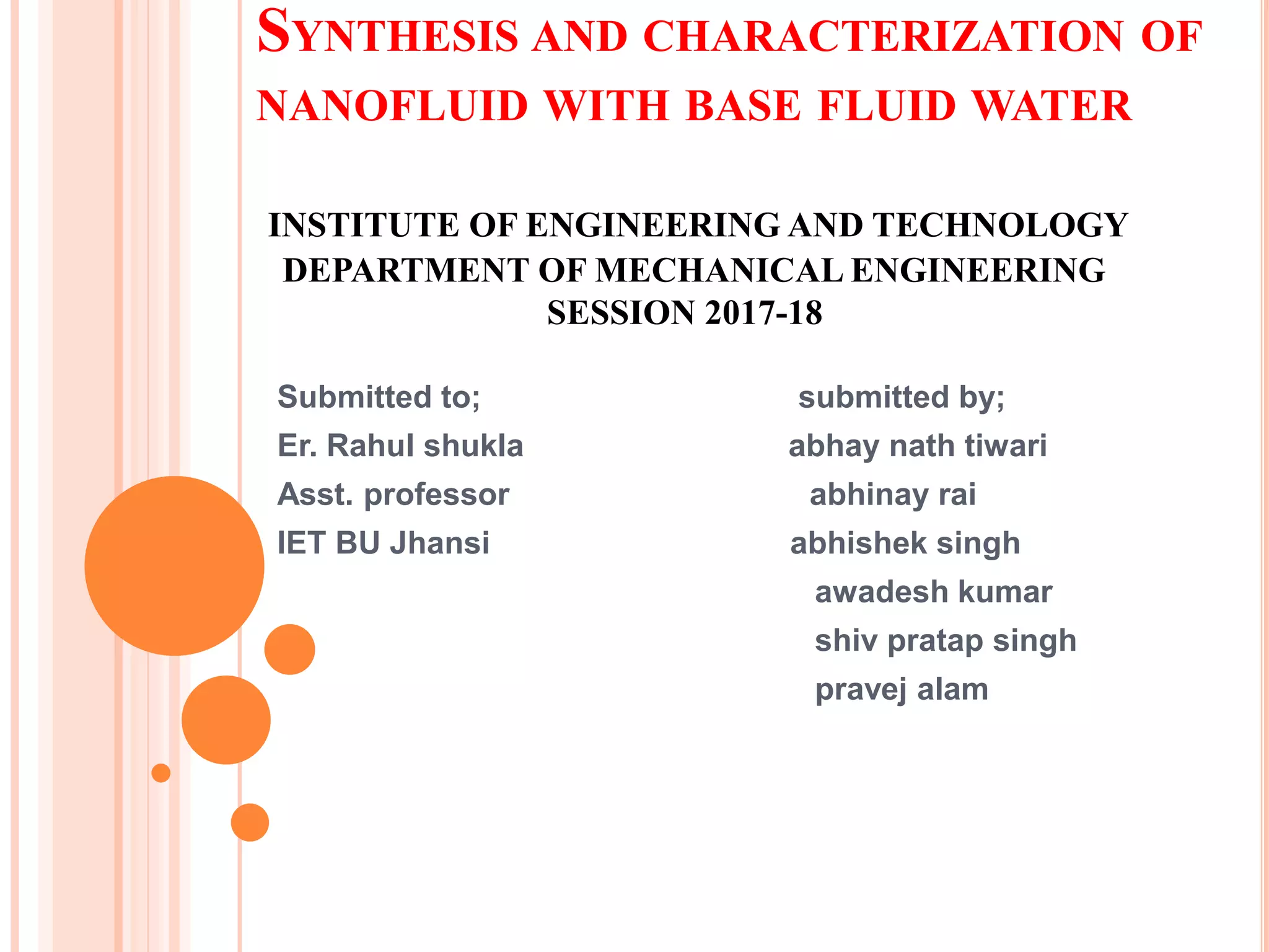 This document summarizes the synthesis and characterization of a nanofluid with water as the base fluid. It discusses the types of nanoparticles and nanofluids, describes the synthesis of cerium oxide nanoparticles and the nanofluid, and presents the experimental methodology used to measure properties like density, viscosity, and thermal conductivity of the nanofluid at varying temperatures and nanoparticle concentrations. The results show that the density, viscosity, and thermal conductivity of the nanofluid increase with increasing nanoparticle concentration. The maximum thermal conductivity achieved is 0.747 W/m-K at a concentration of 1.5% and temperature of 75°C.