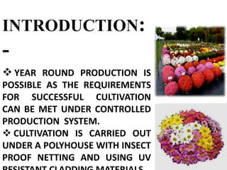 This document provides information on the protected cultivation of chrysanthemums. It discusses growing chrysanthemums in a polyhouse with insect proof netting and UV protection. It covers the common names, origin, family and chromosome number of chrysanthemums. It also discusses the history of chrysanthemum cultivation and the 13 different types of chrysanthemum blooms. The document outlines the requirements for soil, planting materials, planting methods, water and temperature management, and harvesting of chrysanthemums under protected cultivation.