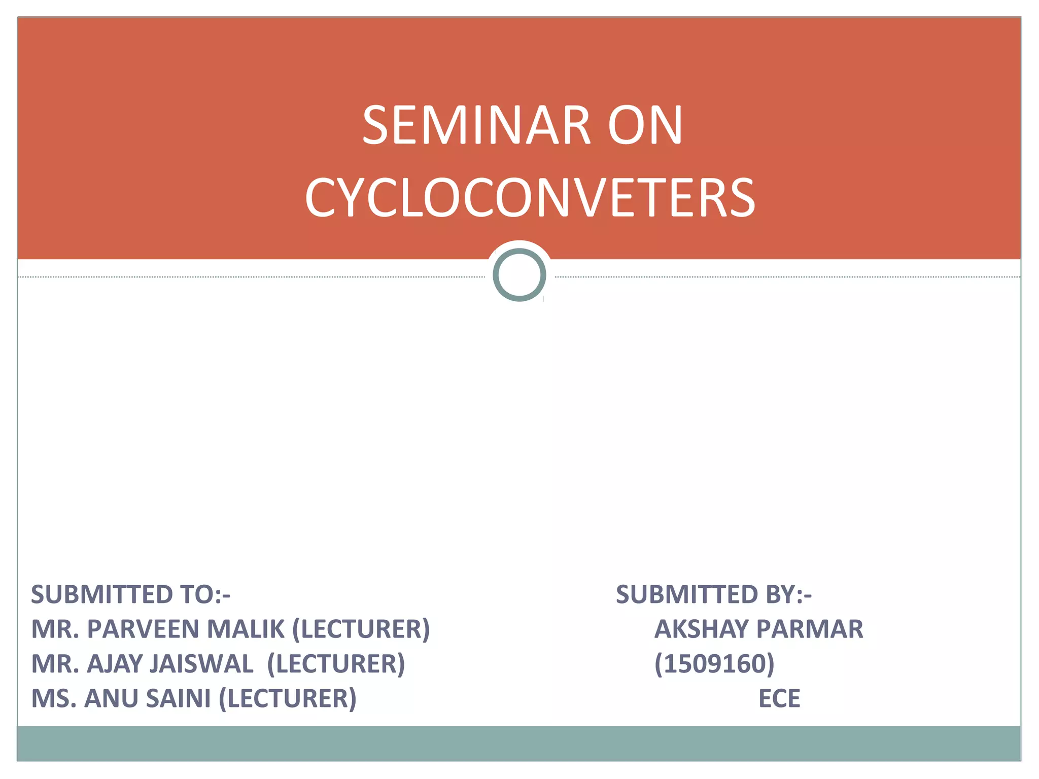 This document discusses cycloconverters, which are devices that convert input power at one frequency to output power at a different frequency in a single stage. It describes the types of cycloconverters including step up, step down, single phase to single phase, and three phase. It provides details on the principles and operation of single phase cycloconverters including mid-point and bridge types for step up and step down conversion. It also discusses three phase to single phase and three phase to three phase cycloconverters. Applications mentioned include speed control drives and induction heating.