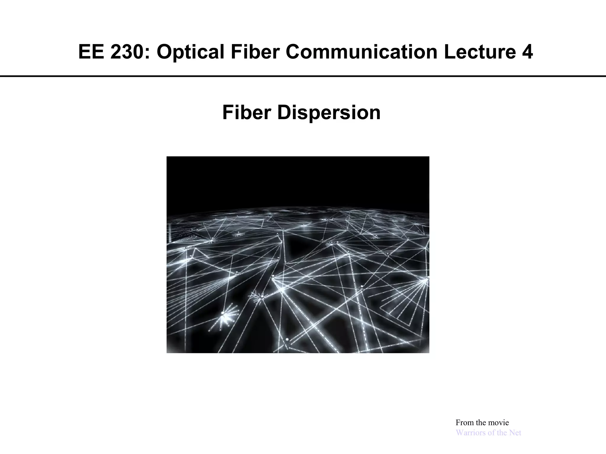 This document discusses different types of dispersion in optical fibers, including modal dispersion, material dispersion, waveguide dispersion, and polarization mode dispersion. It defines important terms related to dispersion like group velocity and group delay. It also examines how dispersion causes pulse broadening over distance as different wavelengths within a pulse propagate at different speeds through the fiber. Finally, it compares the dispersion characteristics of different fiber types like dispersion shifted and flattened fibers which are designed to reduce dispersion effects.