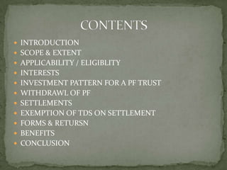 The document outlines the key aspects of the Employee Provident Fund (EPF) scheme in India, including eligibility, contributions from employers and employees, investment patterns, withdrawal procedures, settlements on retirement or termination, exemptions from tax, and benefits. EPF is a mandatory savings program for employees in India that provides tax-deferred savings and a lump sum payment on retirement. Non-compliance by employers can result in penalties like fines and imprisonment.