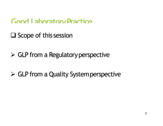 This document provides an overview of Good Laboratory Practice (GLP) from both a regulatory and quality systems perspective. It discusses the scope and importance of GLP for ensuring quality test data, sound laboratory management, and accurate reporting. Key aspects of a GLP-compliant quality system are summarized, including organization, facilities, equipment, documentation, personnel training, sampling methods, and self-inspections. Compliance with GLP is mandated by various regulations to ensure patient safety, meet regulatory expectations, and maintain high customer confidence.